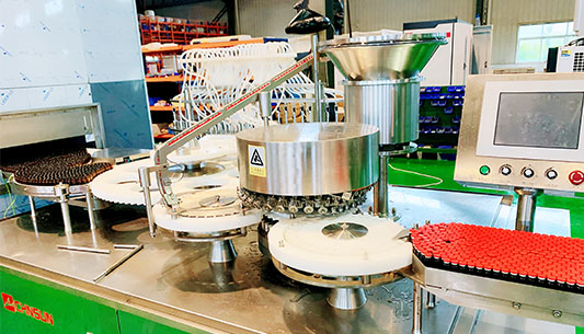 該線由QCK600型立式超聲波洗瓶機、ASMR620/60型熱風循環(huán)式滅菌干燥機、DGF600型灌裝軋蓋機三臺單機組成,分為清洗、干燥滅菌和灌裝封口三個工作區(qū),全線可聯(lián)動生產(chǎn),也可單機使用,該線融入了千山藥機自主知識產(chǎn)權的多項專利技術,符合新版GMP要求。。